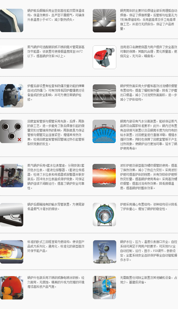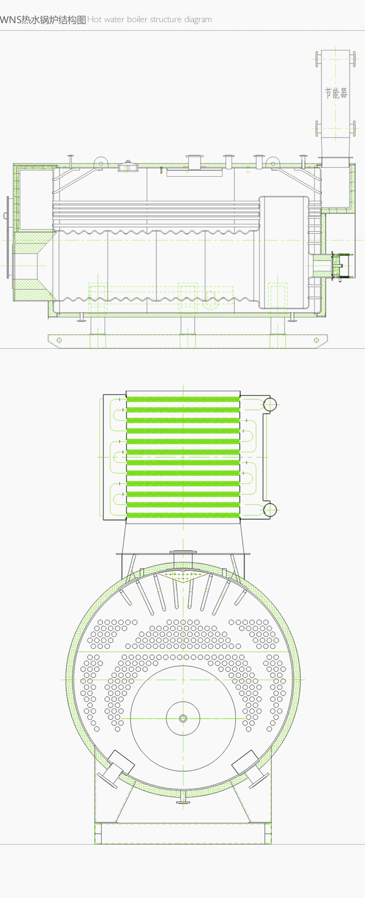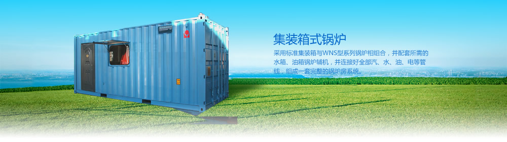 采用标准集装箱与WNS型系列锅炉相组合,并配套所需的水箱、油箱、电控柜、水泵、 全自动水处理设备、分汽包(集分水器)等锅炉辅机,并连接好全部汽、水、油、电等管线,组成一套完整的锅炉房系统,所有设备整装于集装箱内,集装箱设有门、窗、换气百叶窗、排水管等。锅炉控制系统全部能够达到WNS型系列锅炉的自动化运行要求。