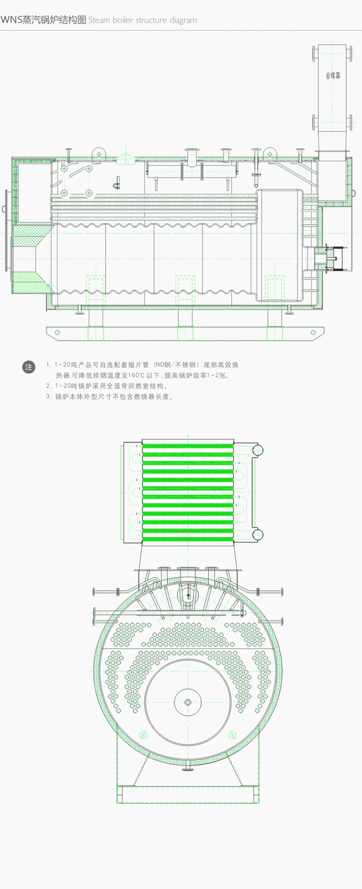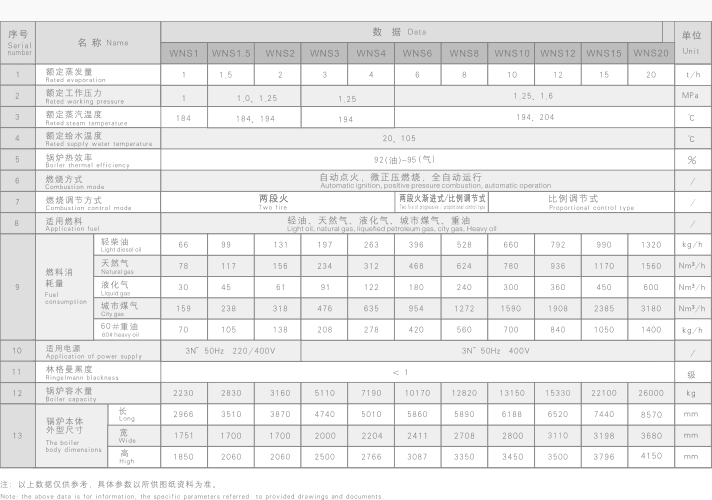 WNS型燃油(气)蒸汽/热水锅炉是我公司90年代自行开发研制生产的环保型节能产品,经过多年的改进及新技术的应用,使该通用型锅炉具有了优良的技术性 能和可靠的安全保障,不仅各项环保指标达到或超过国家的环保标准,而且部分性能指标已超过进口产品。目前该系列产品有0.35MW~14MW热水锅炉,以 及0.5t/h~20t/h蒸汽锅炉。