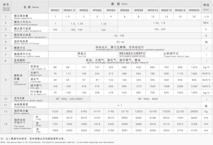 WNS型燃油(气)蒸汽/热水锅炉是我公司90年代自行开发研制生产的环保型节能产品,经过多年的改进及新技术的应用,使该通用型锅炉具有了优良的技术性能和可靠的安全保障,不仅各项环保指标达到或超过国家的环保标准,而且部分性能指标已超过进口产品。目前该系列产品有0.35MW~14MW热水锅炉,以及0.5t/h~20t/h蒸汽锅炉。