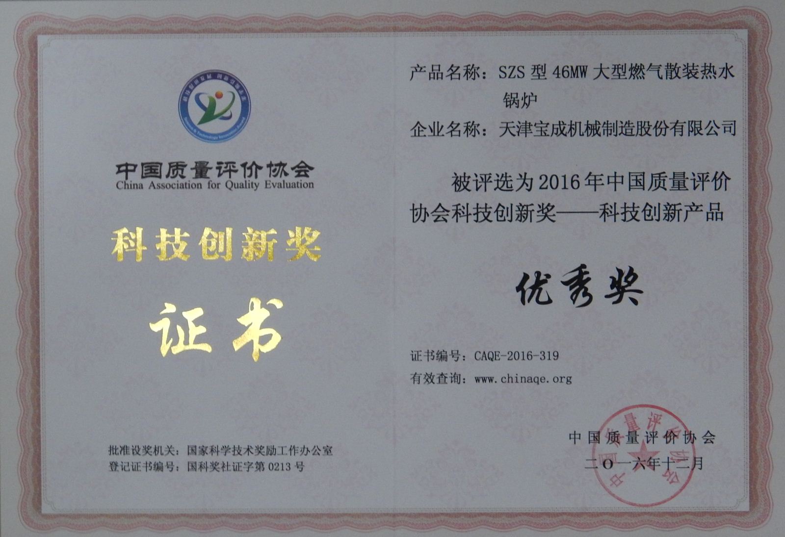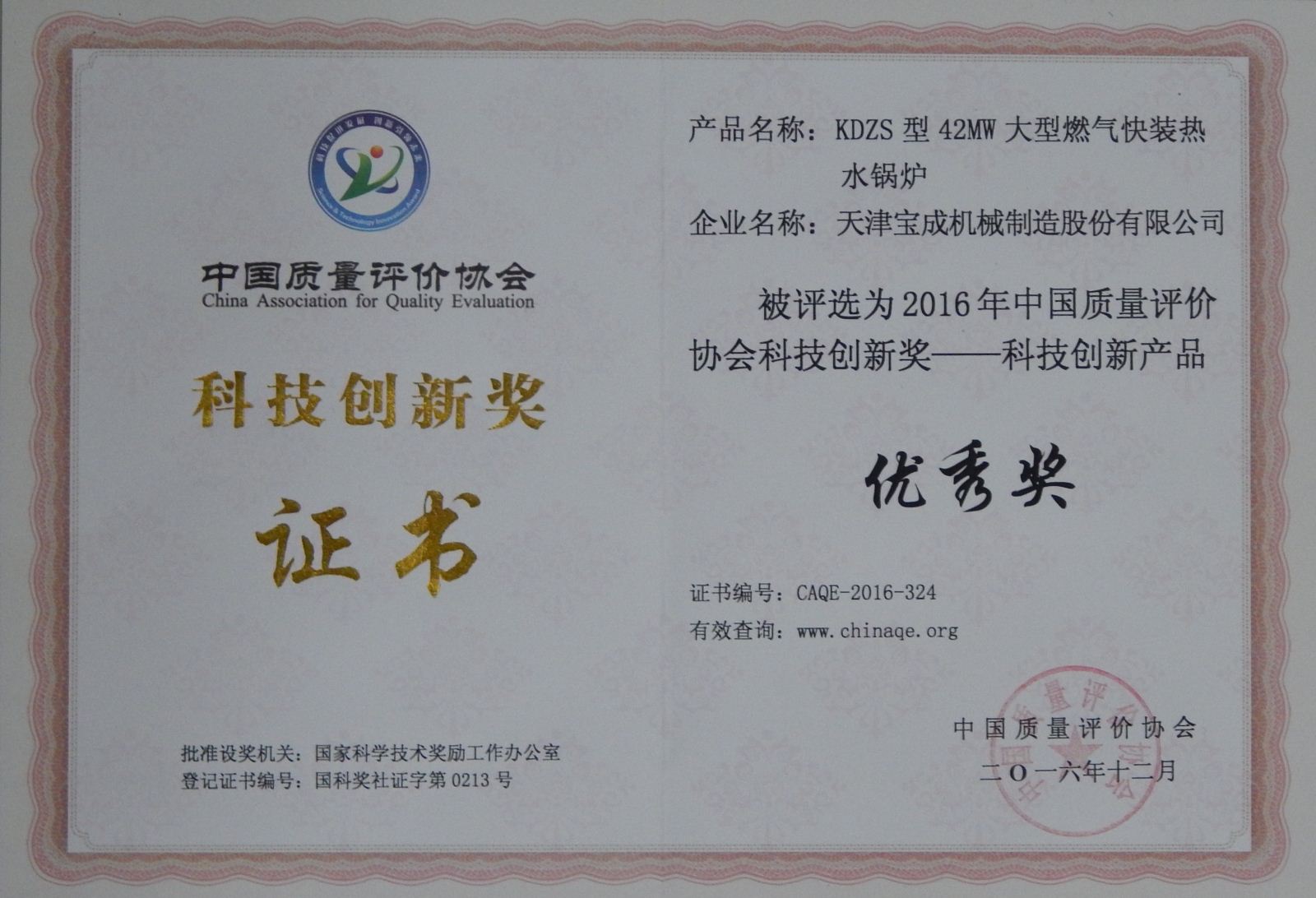 日前,中国质量协会2016年科技创新奖评选揭晓,天津宝成机械制造股份有限公司两项产品获得奖励。即:SZS型46MW大型燃气散装热水锅炉和KDZS型42MW大型燃气快装热水锅炉被评选为2016年中国质量评价协会科技创新奖-----科技创新产品优秀奖,实现了燃气热水锅炉科技研发的新突破。